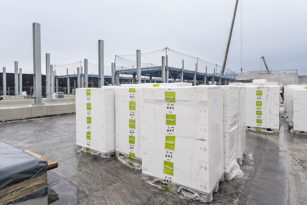 In total, around 4,400 cubic meters of insulation were used to cover 25,000 square meters, making it the largest flat roof project in Multipor’s history. Xella provided custom gradient plans for water drainage, and the installation was carried out efficiently thanks to strong collaboration with the roofing contractor. This setup ensures durability, weather resistance, and the ability to support various loads, from walkways and gravel to green roofs and HVAC (heating, ventilation, and air conditioning) systems.