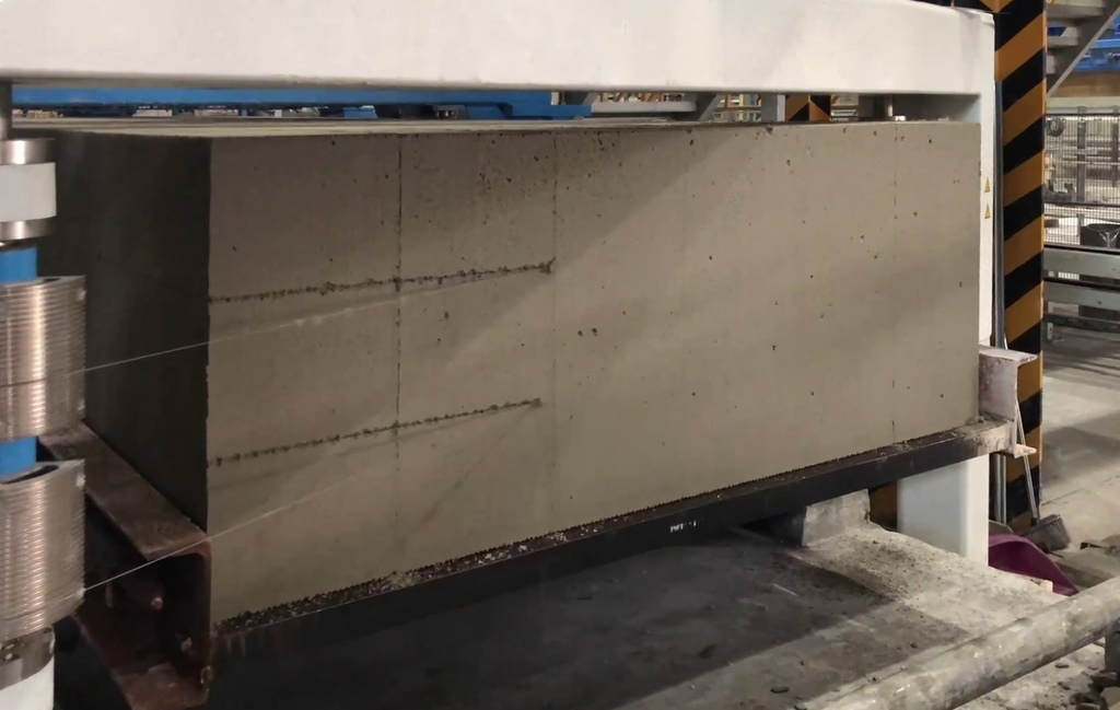 With oscillating movements, short, pneumatically tensioned wires precisely cut the green cake to the required panel length (for blocks, it will determine their height). This machine, known as the cross cutter, is equipped with an integrated vacuum unit that removes the top layer (the top crust) and returns it to the slurry recycling system.