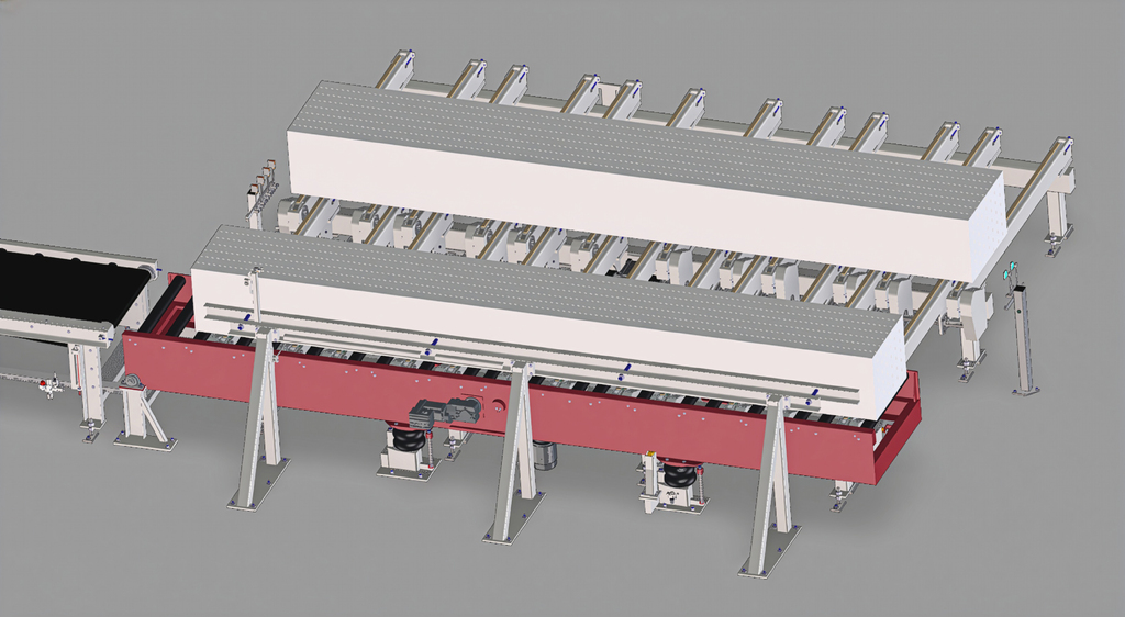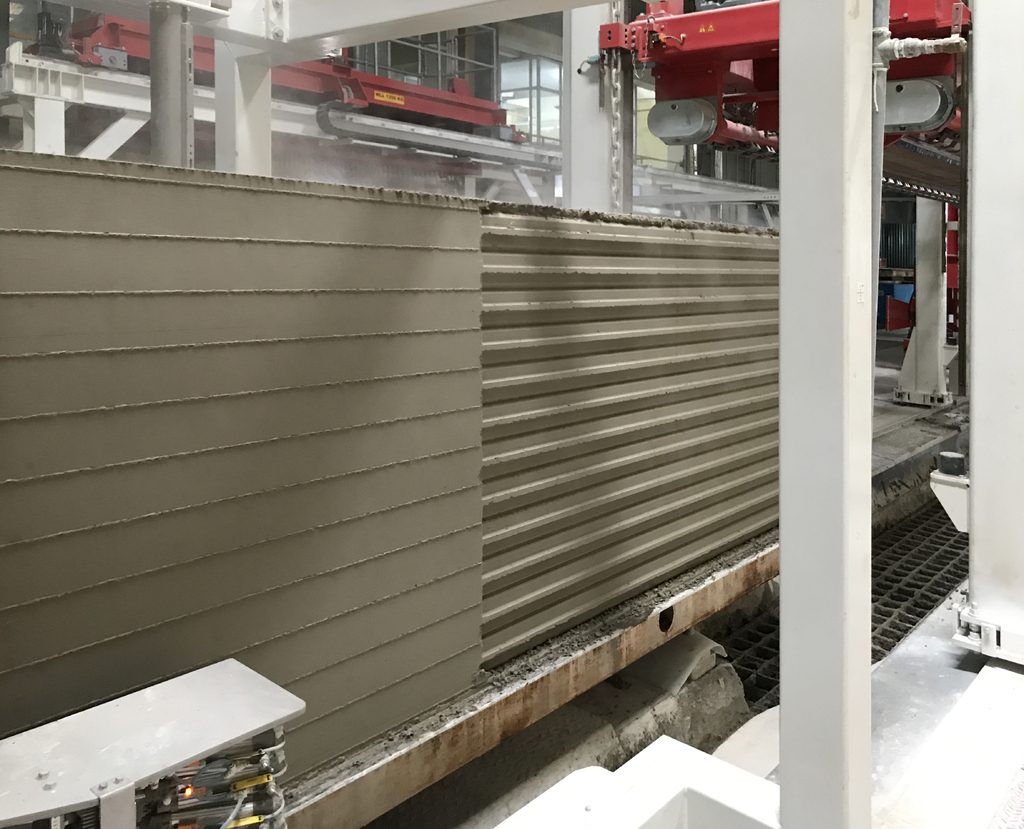 A specialised unloading system enables automated, individual handling of the panels. The unloading manipulator places the hardened (white) cake containing the reinforced elements directly onto the panel unloading system. This system consists of a series of conveyor belts that transport the white cake to a designated position for strapping and unloading. Each cake contains multiple panels. The system can separate these into individual panels or customised groups for flexible handling. All panel groups can be manually strapped if required.