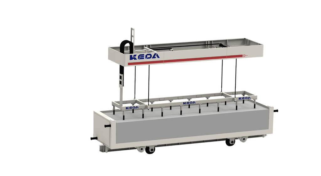 Keda´s mould oiling machine employs servo-driven motion and closed-loop control for automatic travel, precise positioning, and spraying. With a cycle time of only 80 seconds per 6 m mould, rotating spray heads ensure full coverage with adjustable thickness for different green cake specifications.