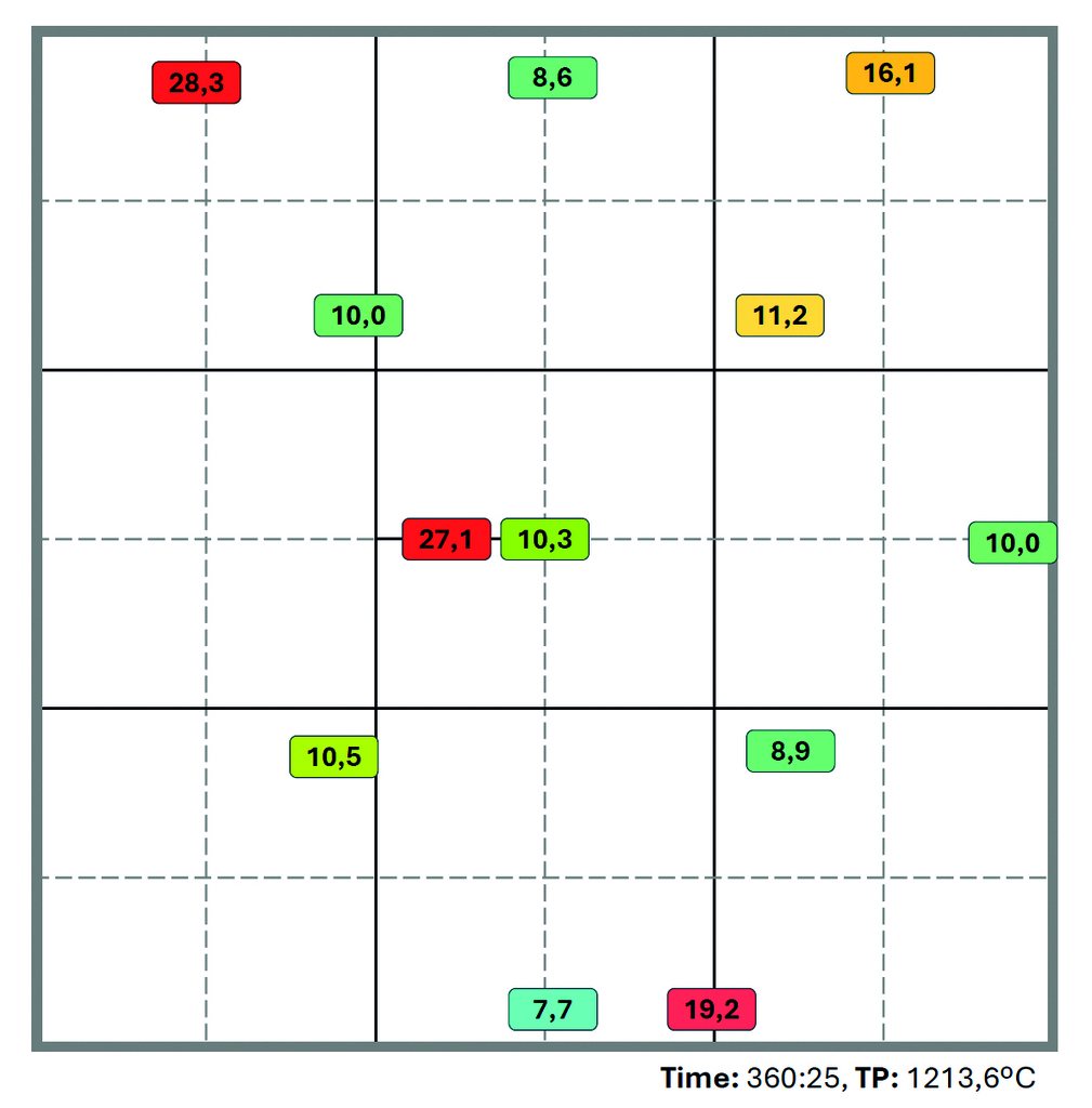 Throughout the test, none of the fire resistance criteria were exceeded. The wall maintained its structural integrity (criterion R), no breaches or openings were observed (criterion E), and thermal insulation performance was preserved (criterion I)—with no temperature rise exceeding 180K at any measurement point. At minute 361, the furnace temperature exceeded 1200 ºC, while the temperature increased on the unexposed side ranged from only 7.3K to 10.7K at standard measurement points. A higher temperature rise (maximum 28.1K) was recorded at the location where repair plates had been installed due to transport damage. No excessive deflection was observed during the test; the maximum allowable deflection of 100 mm was not exceeded. The highest recorded deflection was 1.1 mm, measured at minute 340.