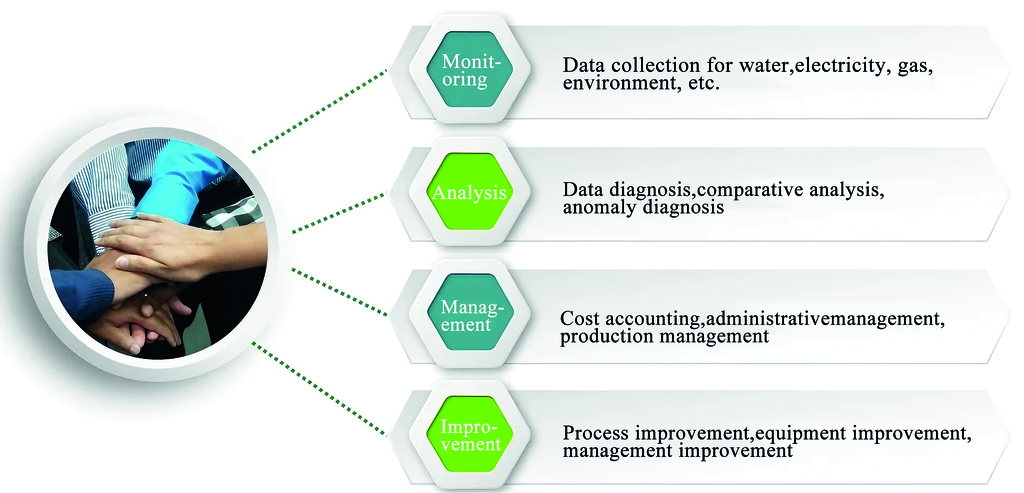 Monitors energy (water, electricity, gas) usage data of the production line, enabling energy itemization, automatic meter reading, and calculation of energy costs combined with production data. Provides weekly, monthly, and yearly dimensional reports, comprehensive query functions, including total usage of different energy types with year-on-year and month-on-month analysis, abnormal data analysis, and abnormal alarms. The energy consumption trend analysis page supports displaying daily trend changes for energy consumption in various areas of the entire line using bar charts and provides corresponding energy consumption optimization strategies.
